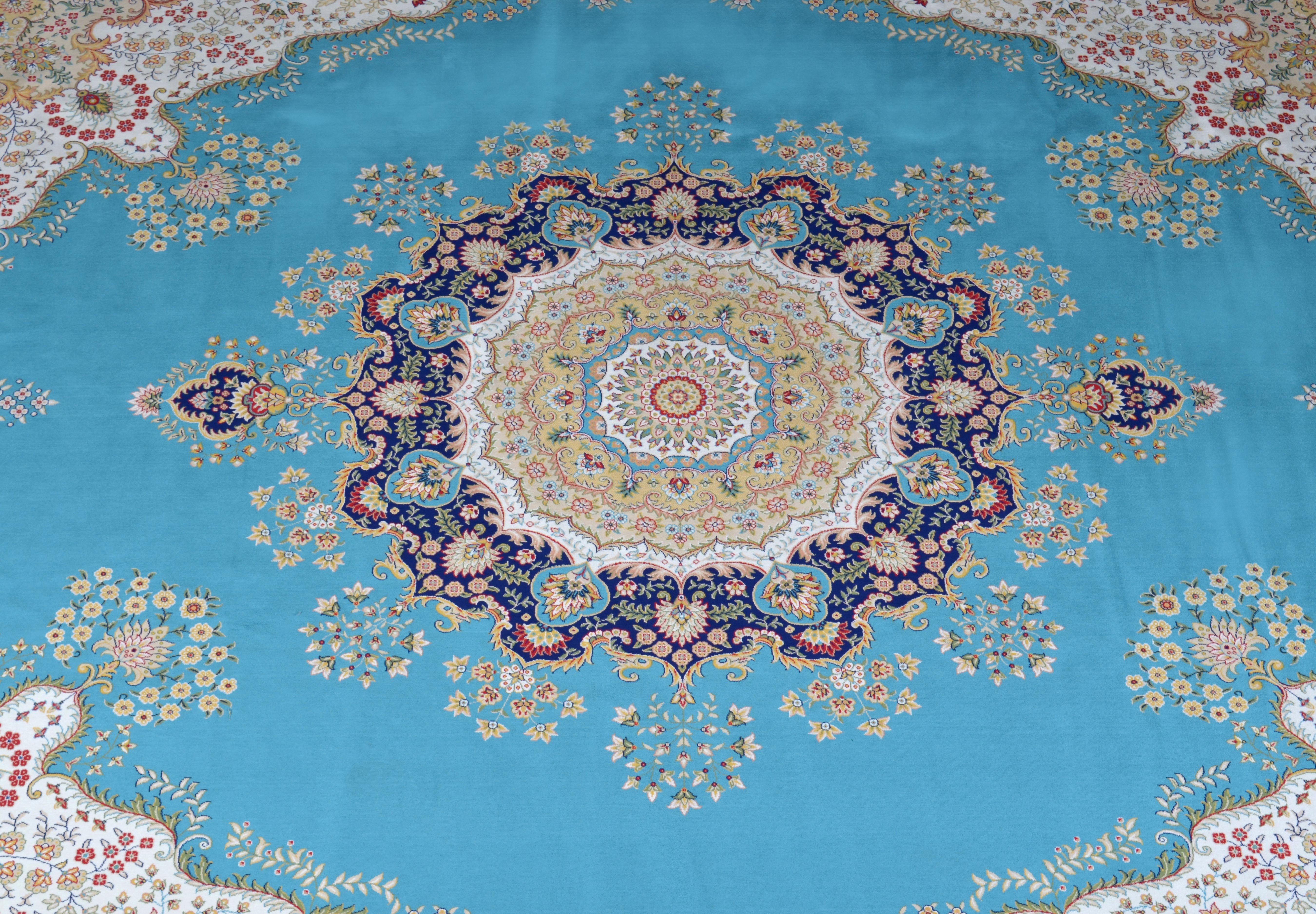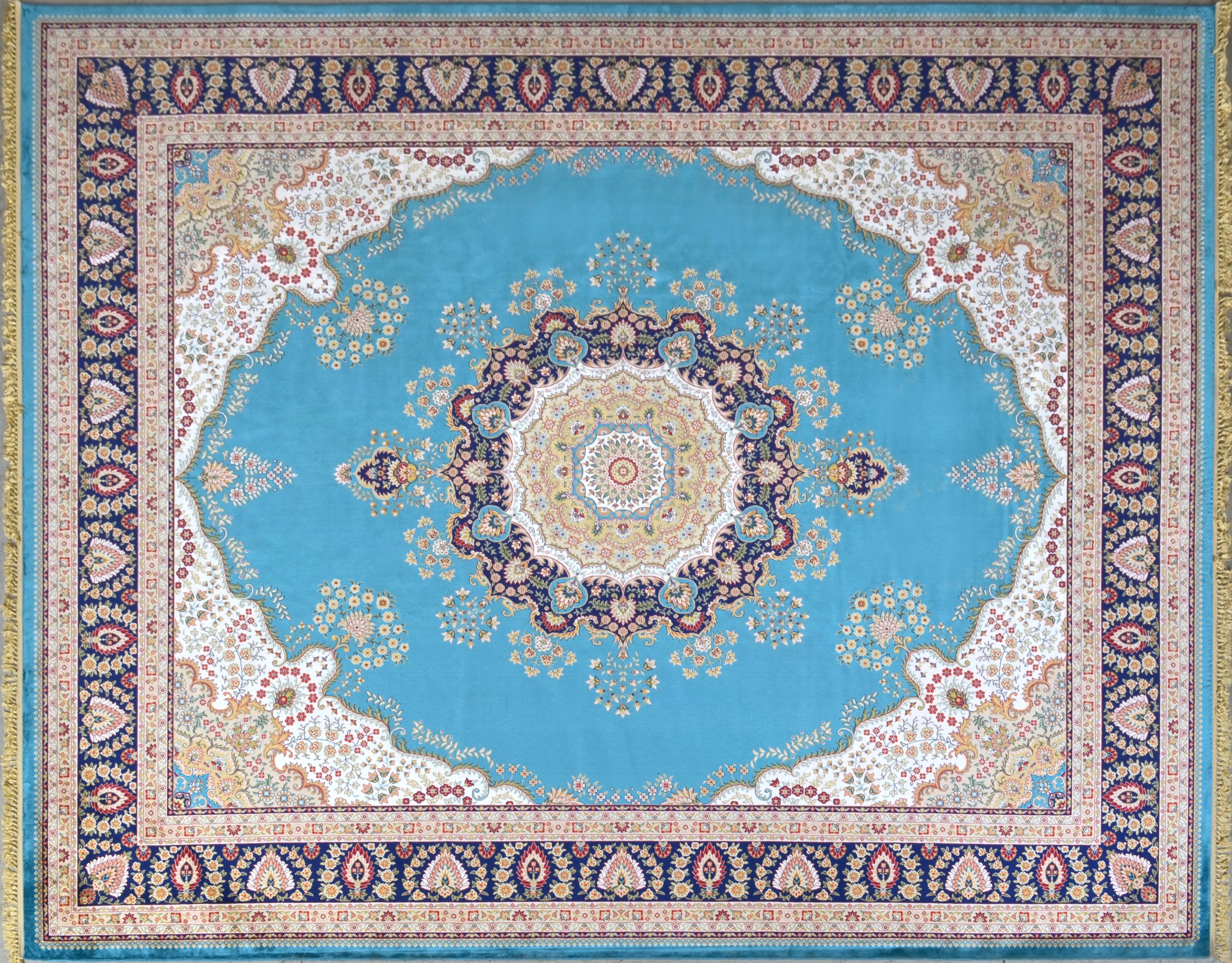 One of the newest additions to our Persian Style Palace Rugs is this hard to find extremely rare oversized Palace Rug offered in a monumental size of 13 x 16 feet over 200 square feet of elegance from our Kashan Design Blue Collection. So striking in scale and beauty. A spectacular color combination with Turquoise Teal Blue Fields surrounded by exciting accent colors offering contrast with dark Black Blue, Cream and touches of Burgundy. Designer's understand that floor is the foundation of any well designed room as we naturally look were we walk. This Kashan Design Blue Palace Rug will create a stunning first impression and will certainly help define spaces, accent furniture, or simply add some welcome color and texture to a room. The history of Kashan design's originate from Kashan an oasis town along the Kavir desert, in central Iran. It is one of the oldest cities in Iran, As early as the 17th century Kashan had a well established silk area rug industry. Coveting by kings, at one time it was commonplace to see Kashan rugs hanging on palace walls all over the world. It is for this reason that it is also referred to as the palace carpet. This modern interpretation is manufactured using a lustrous Viscose pile referred to also as synthetic silk. When combined with its 1 million point manufacturing detail made possible by production using a state of the art face-to-face power loom assures the highest consistent quality across all its designs. There are many popular sizes offered in this TIMELESS TREASURES RUG COLLECTION, consider matching this large room rug with one of its matching accent rugs or runner offerings for a fresh take of style and color in Timeless Old World Luxury!