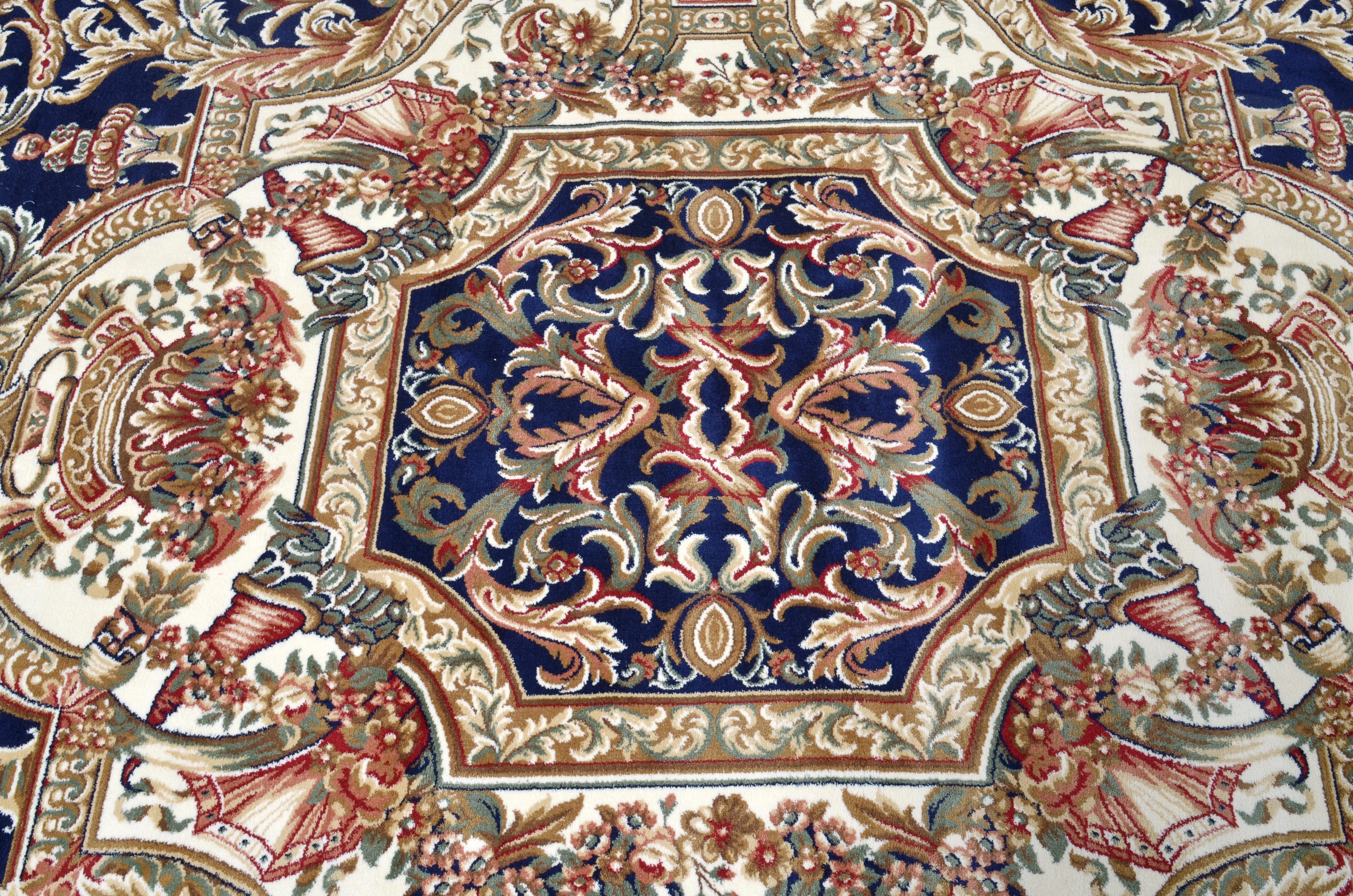 Offered is a ROYAL Aubusson BLACK BLUE AND IVORY in a very popular room size of 7 x 10 feet. This dramatic design features a royal dark Black Blue body with classic Aubusson accent details and with Ivory contrasts. This pleasing French Designed Rug will help define spaces, accent furniture, or simply add some welcome color and texture to a room. The history of Aubusson design dates back to the 14th century. The town of Aubusson is located in the La Marche area of France. This modern interpretation is manufactured using a lustrous Viscose pile referred to also as synthetic silk. When combined with its 1 million point manufacturing detail made possible by production using a state of the art face-to-face power loom assures the highest consistent quality across all its designs. There are many popular sizes offered in this TIMELESS TREASURES RUG COLLECTION, consider pairing this with one of its Aubusson designed Matching accent rugs or runners for a complete luxurious Interior!