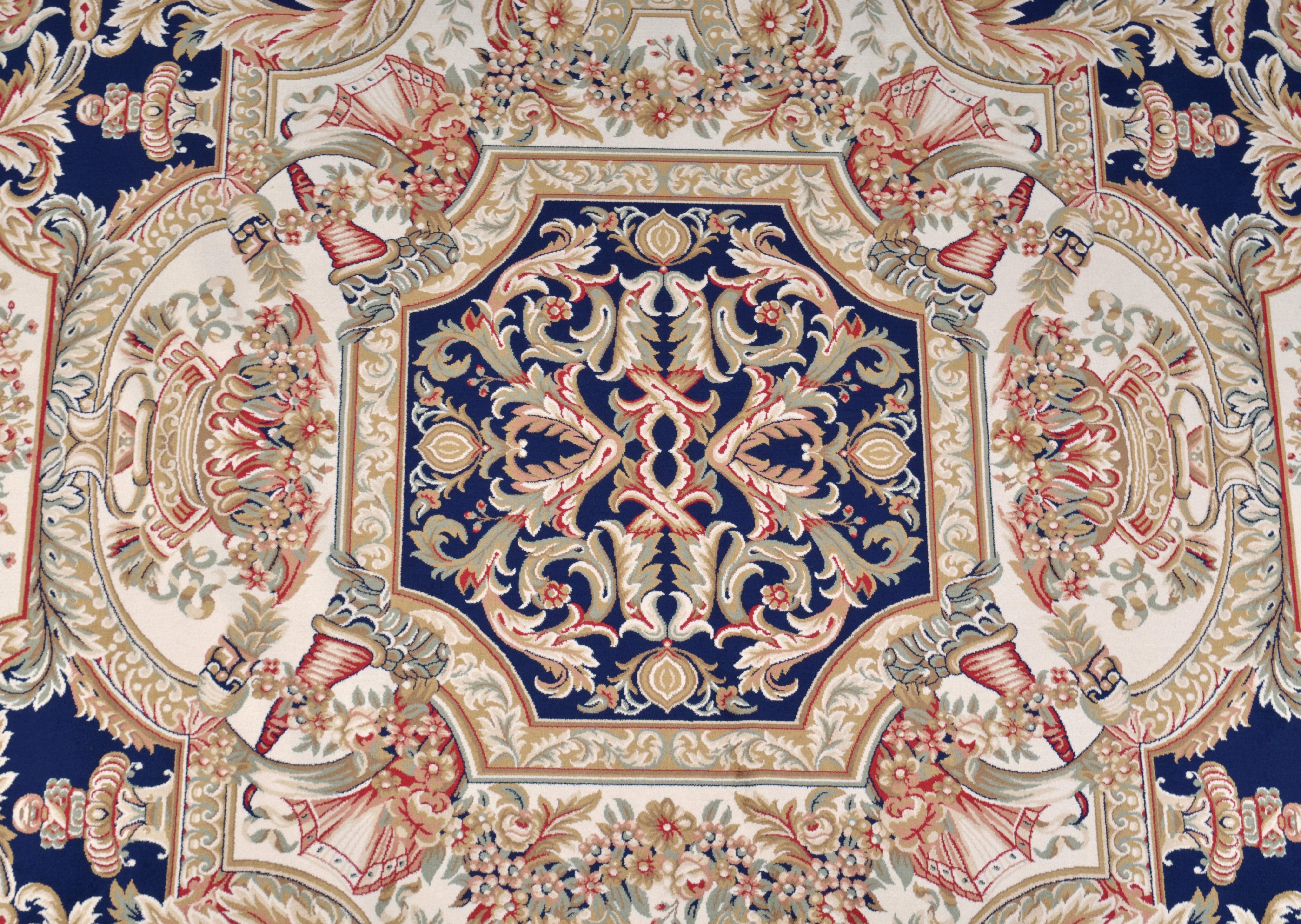 Offered is a ROYAL Aubusson BLACK BLUE AND IVORY in a large size of 9 x 11 feet. This dramatic design features a royal dark Black Blue body with classic Aubusson accent details and with Ivory contrasts. This pleasing French Designed Rug will help define spaces, accent furniture, or simply add some welcome color and texture to a room. The history of Aubusson design dates back to the 14th century. The town of Aubusson is located in the La Marche area of France. This modern interpretation is manufactured using a lustrous Viscose pile referred to also as synthetic silk. When combined with its 1 million point manufacturing detail made possible by production using a state of the art face-to-face power loom assures the highest consistent quality across all its designs. There are many popular sizes offered in this TIMELESS TREASURES RUG COLLECTION, consider pairing this with one of its Aubusson designed Matching accent rugs or runners for a complete luxurious Interior!
