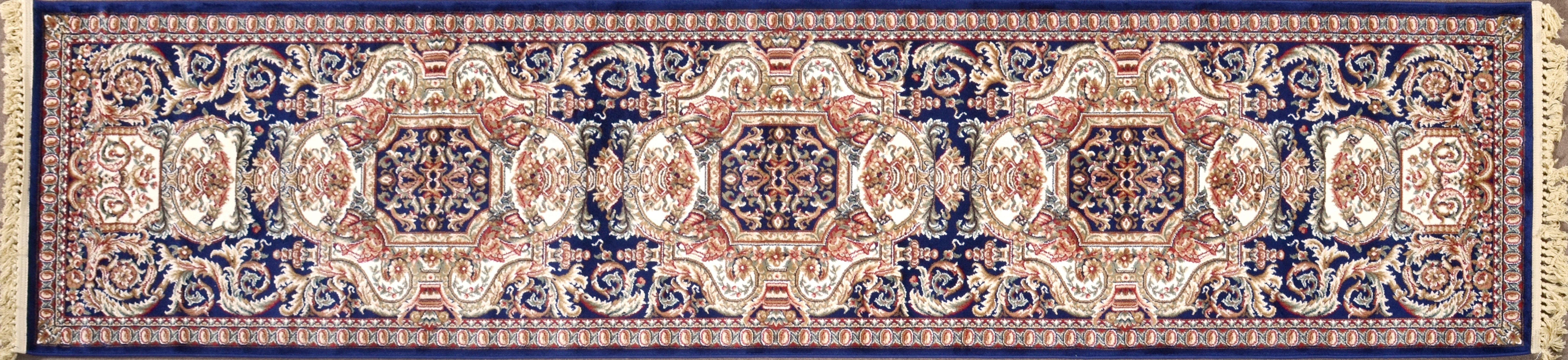 Offered is a ROYAL Aubusson BLACK/BLUE AND IVORY in a very popular runner size of 3 x 10 feet long. This dramatic design features a royal dark Black/ Blue body with classic Aubusson accent details and with Ivory contrasts. This pleasing French Designed Rug will help define spaces, accent furniture, or simply add some welcome color and texture to a room. The history of Aubusson design dates back to the 14th century. The town of Aubusson is located in the La Marche area of France. This modern interpretation is manufactured using a lustrous Viscose pile referred to also as synthetic silk. When combined with its 1 million point manufacturing detail made possible by production using a state of the art face-to-face power loom assures the highest consistent quality across all its designs. There are many popular sizes offered in this TIMELESS TREASURES RUG COLLECTION, consider pairing this with one of its Aubusson designed Matching room sized rugs for a complete luxurious Interior!