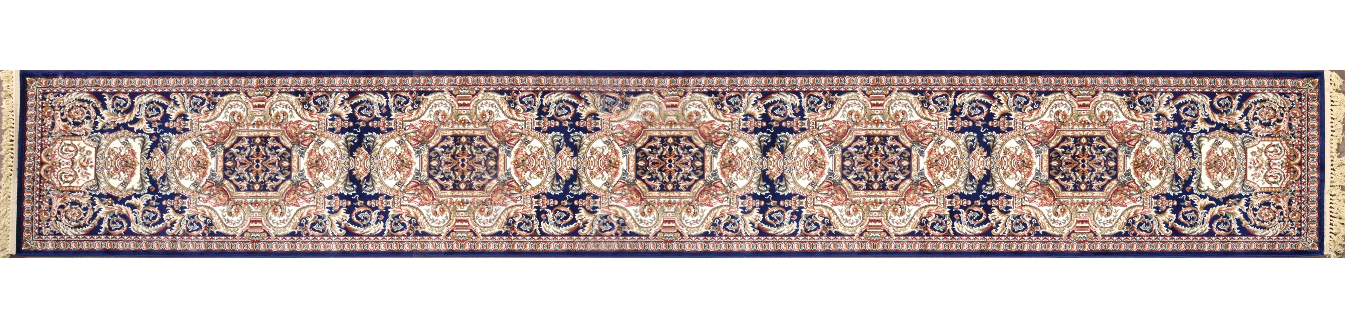 Offered is a ROYAL Aubusson BLACK BLUE AND IVORY in a rare oversized runner of 3 x 18 feet long. A perfect option for an extra long hallway or even a set of stairs. This dramatic design features a royal dark Black Blue body with classic Aubusson accent details and with Ivory contrasts. This pleasing French Designed Rug will help define spaces, accent furniture, or simply add some welcome color and texture to a room. The history of Aubusson design dates back to the 14th century. The town of Aubusson is located in the La Marche area of France. This modern interpretation is manufactured using a lustrous Viscose pile referred to also as synthetic silk. When combined with its 1 million point manufacturing detail made possible by production using a state of the art face-to-face power loom assures the highest consistent quality across all its designs. There are many popular sizes offered in this TIMELESS TREASURES RUG COLLECTION, consider pairing this with one of its Aubusson designed Matching room sized rugs for a complete luxurious Interior!