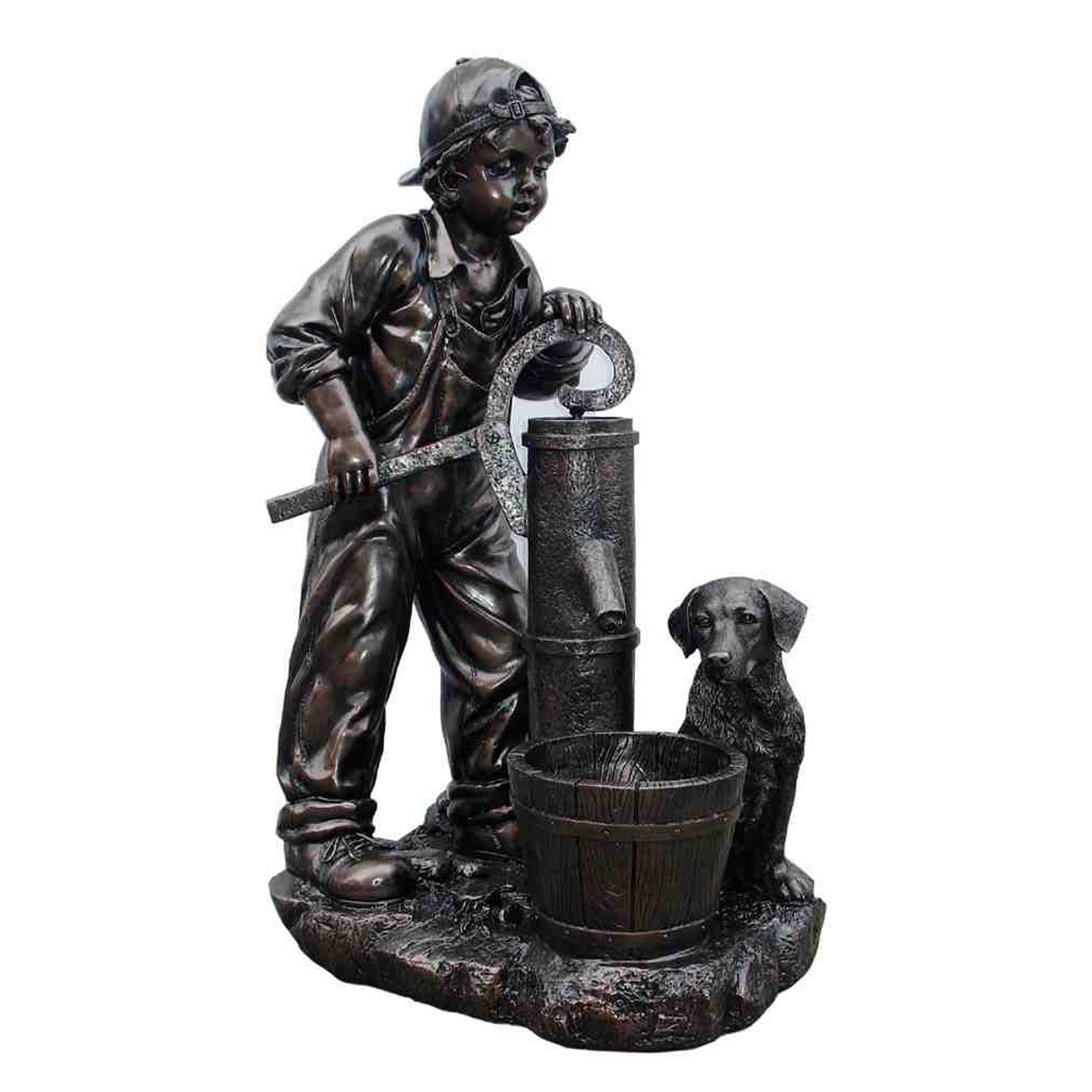 From our self contained working fountain Collection comes this new fountain Creation. Depicting a Boy and Dog at Water Pump Fountain Self Contained. In this sculpture a young boy with his best friend working a water pump to fill the recycling bucket basin. Creating this functional feature for your Decor that bring smiles to all. This unique self contained Fountain stands 38.5 Inches Tall. The item comes with an all weather bronze style of finishing. It is hand cast in durable all weather Fiberglass for long lasting use. Fountain pump is provided and operate with standard 110 v power. Minor assembly is required.
