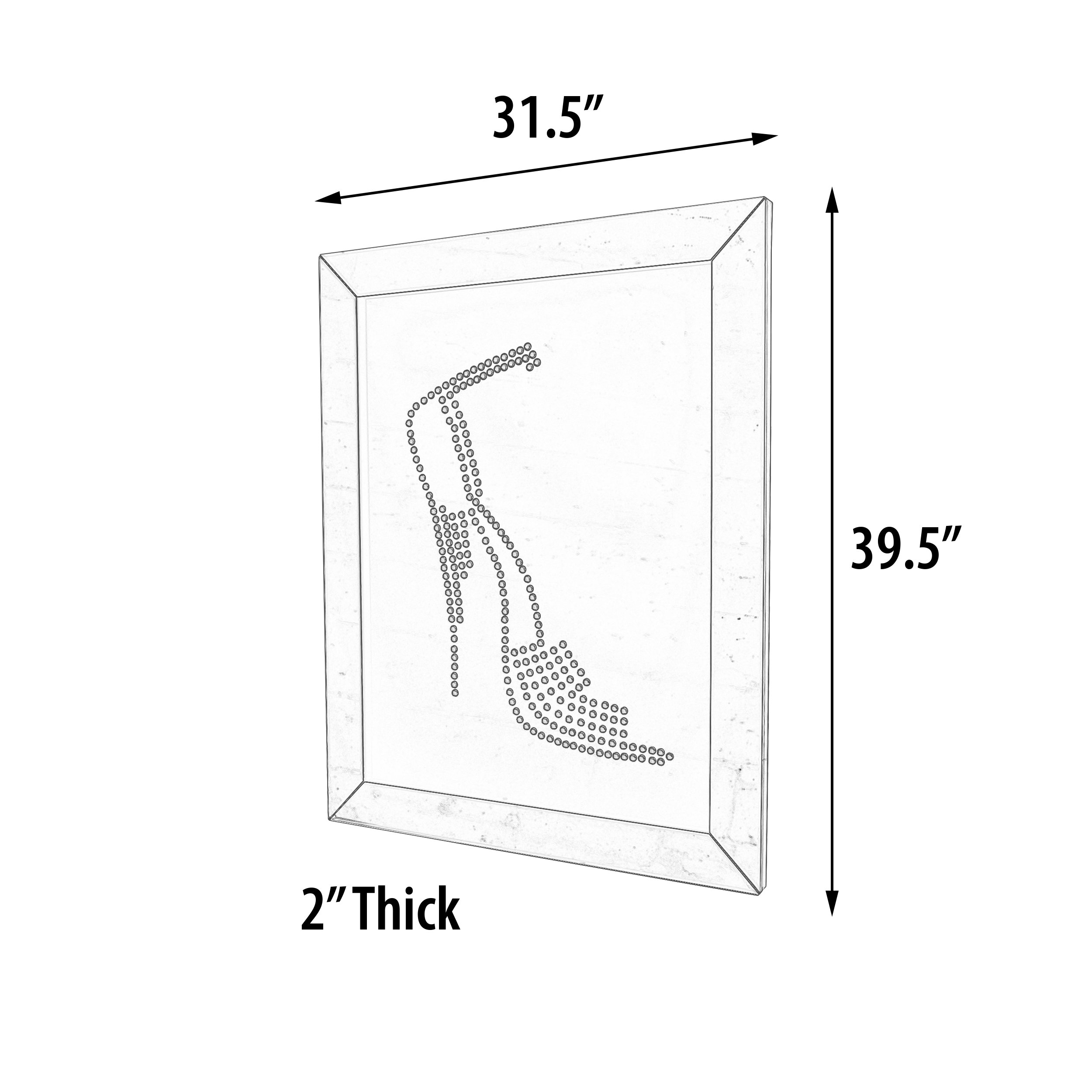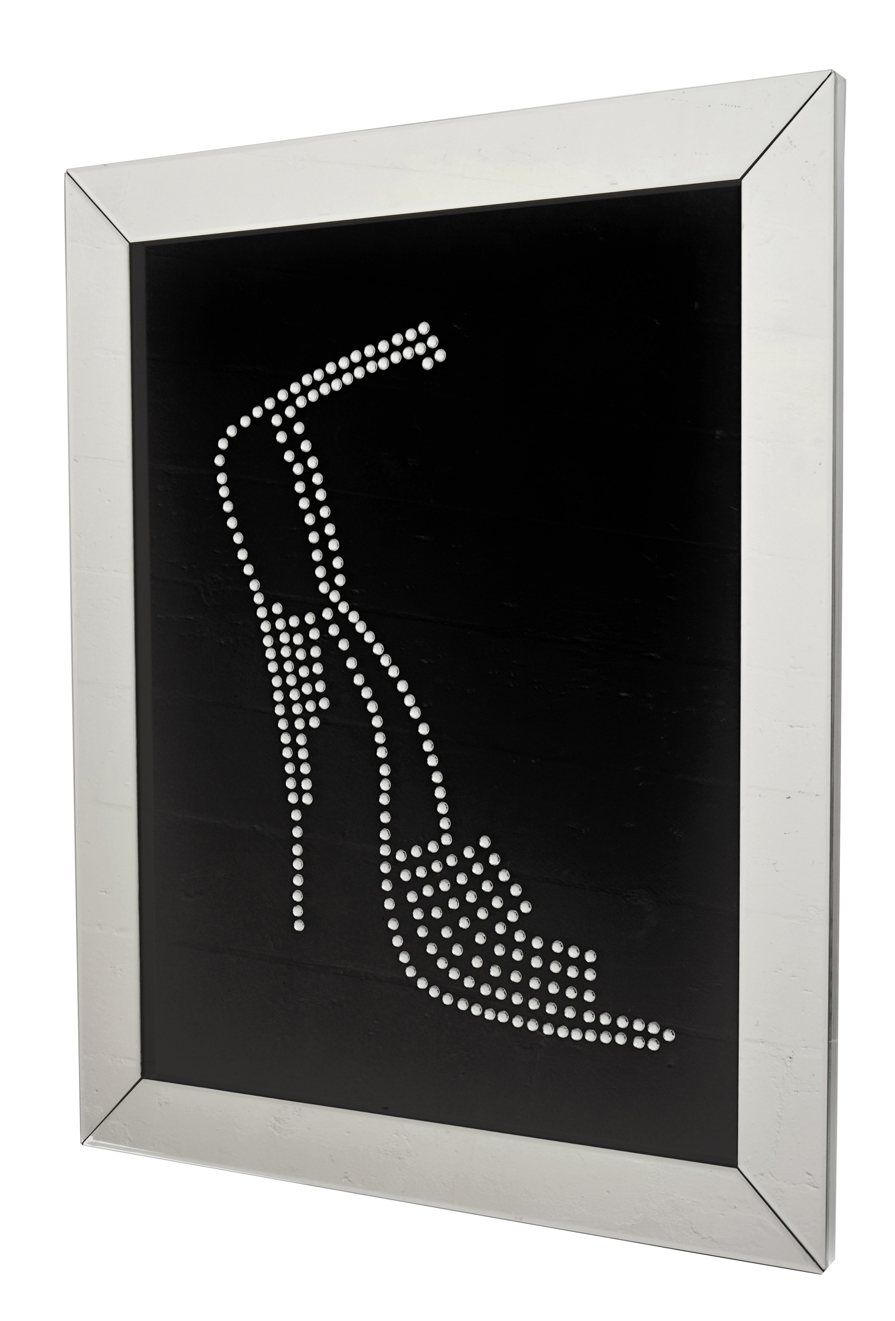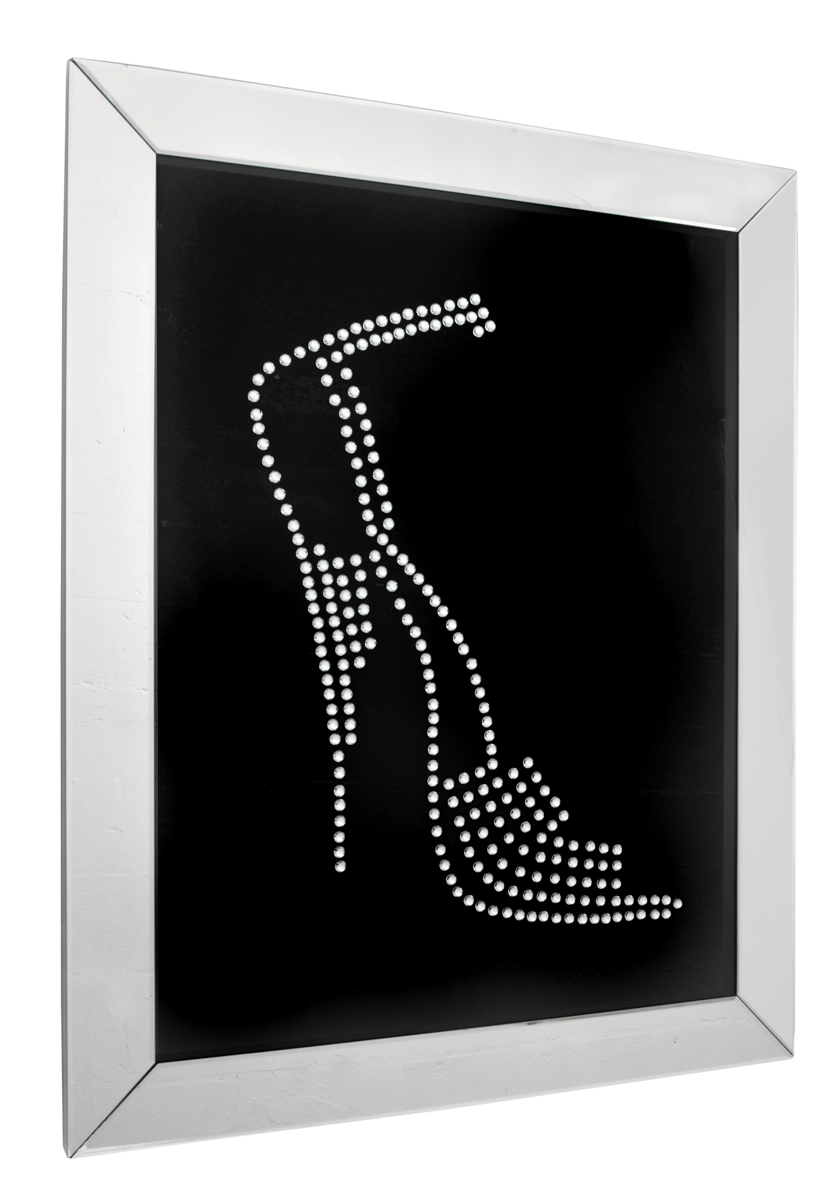 Add interest to your living space with this elegant Crystal Shadow Mirror Shoe. The dramatically casted Shoe shaped mirror is the perfect contrast against its black background. Faceted optic glass faux crystals adorn the Shoe, layering it with added luxe and brilliance.