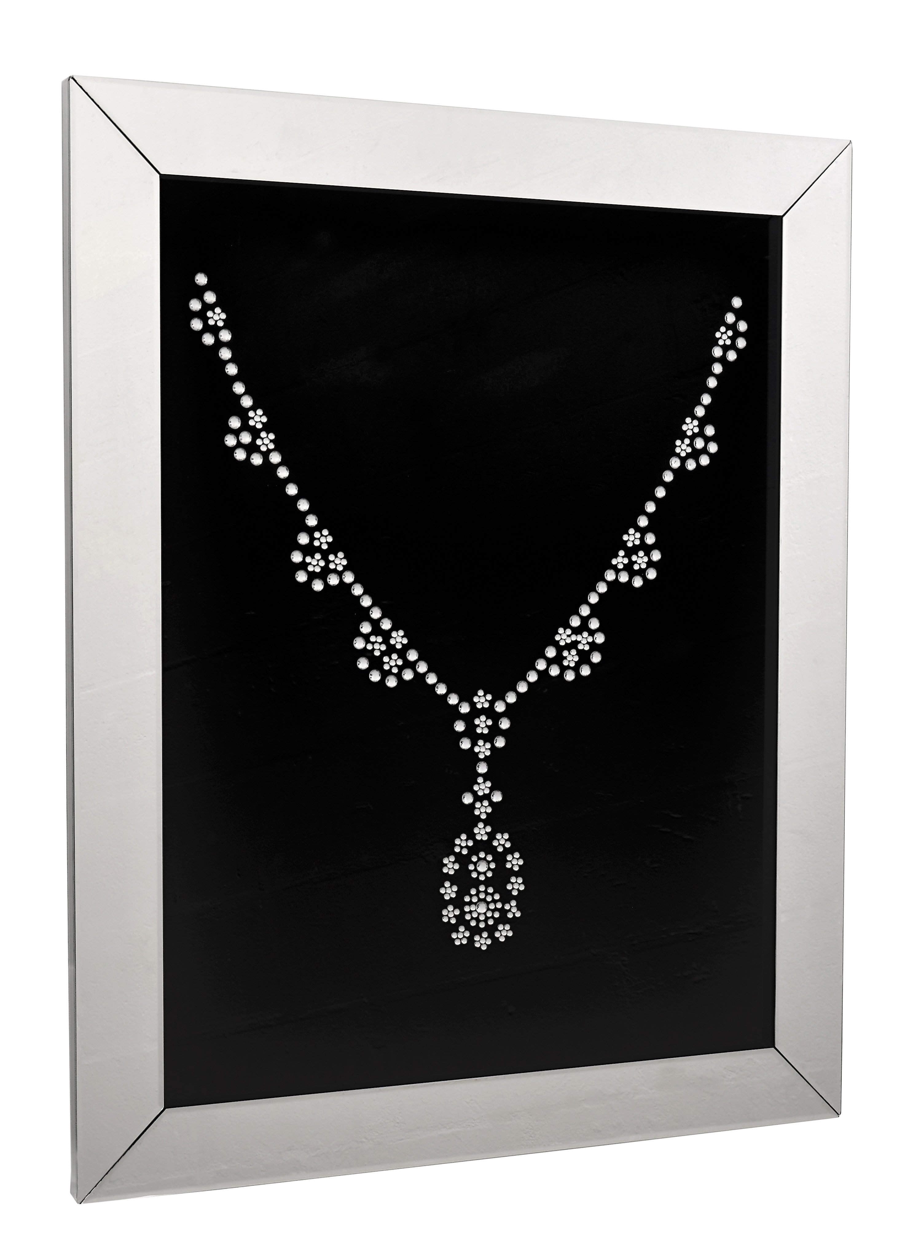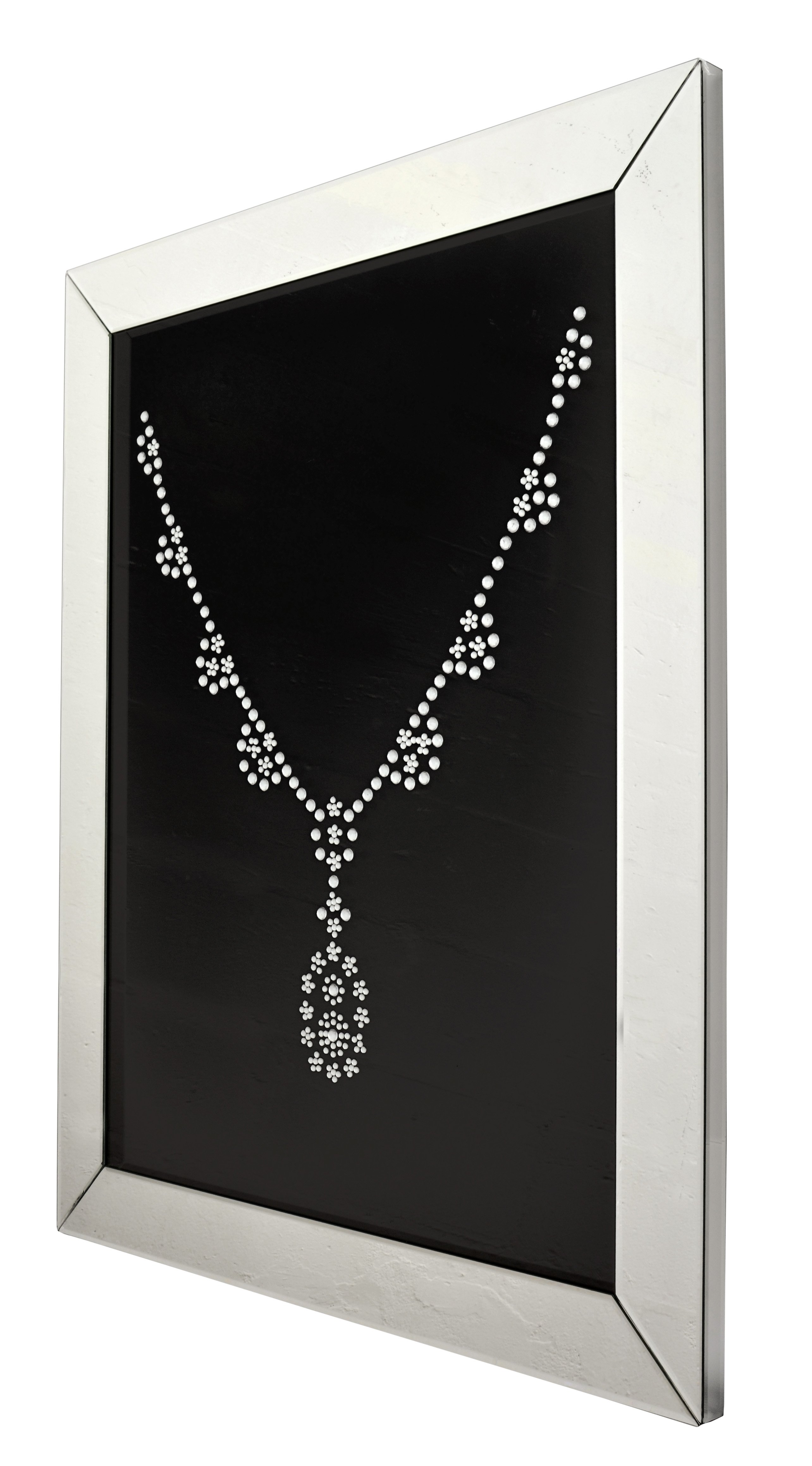 Add interest to your living space with this elegant Crystal Shadow Mirror Necklace. The dramatically casted Necklace shaped mirror is the perfect contrast against its black background. Faceted optic glass faux crystals adorn the Necklace, layering it with added luxe and brilliance.