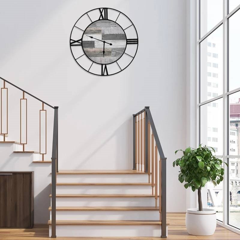 It is functional and adds elegance and style to your home; this Large 32-inch Roman Numeral Wall Clock Black Metal with Grey Wood Interior is a good choice. No more worry about annoying ticking. We use high-end quiet movement to ensure your thoughts or sweet dream won't bother. This wall clock decor has an attractive look that will make your home unique. Upgrade your home décor. The combine of black metal frame and wood grain splicing central part, open pass-through design, large hands, and Roman numbers, create a classic farmhouse style for your home. This farmhouse wall clock features a 32-inch diameter that grabs guests' attention. An excellent gift idea is a clock for the living room, bedroom, entryway, dining room, and home office. A big wall clock with no-second-hand, it uses high-quality quartz movement producing no ticking noises, so you can hear yourself think and get some sleep. If you ever do have problems, we provide an extra replacement hand. With the built-in hook, this large clock is convenient for you to hang and causes less damage to the wall. Required an AA battery (not included). Made of selected metal, fir wood, high-end quartz movement and pointers, so you don't worry about rust or cracking.