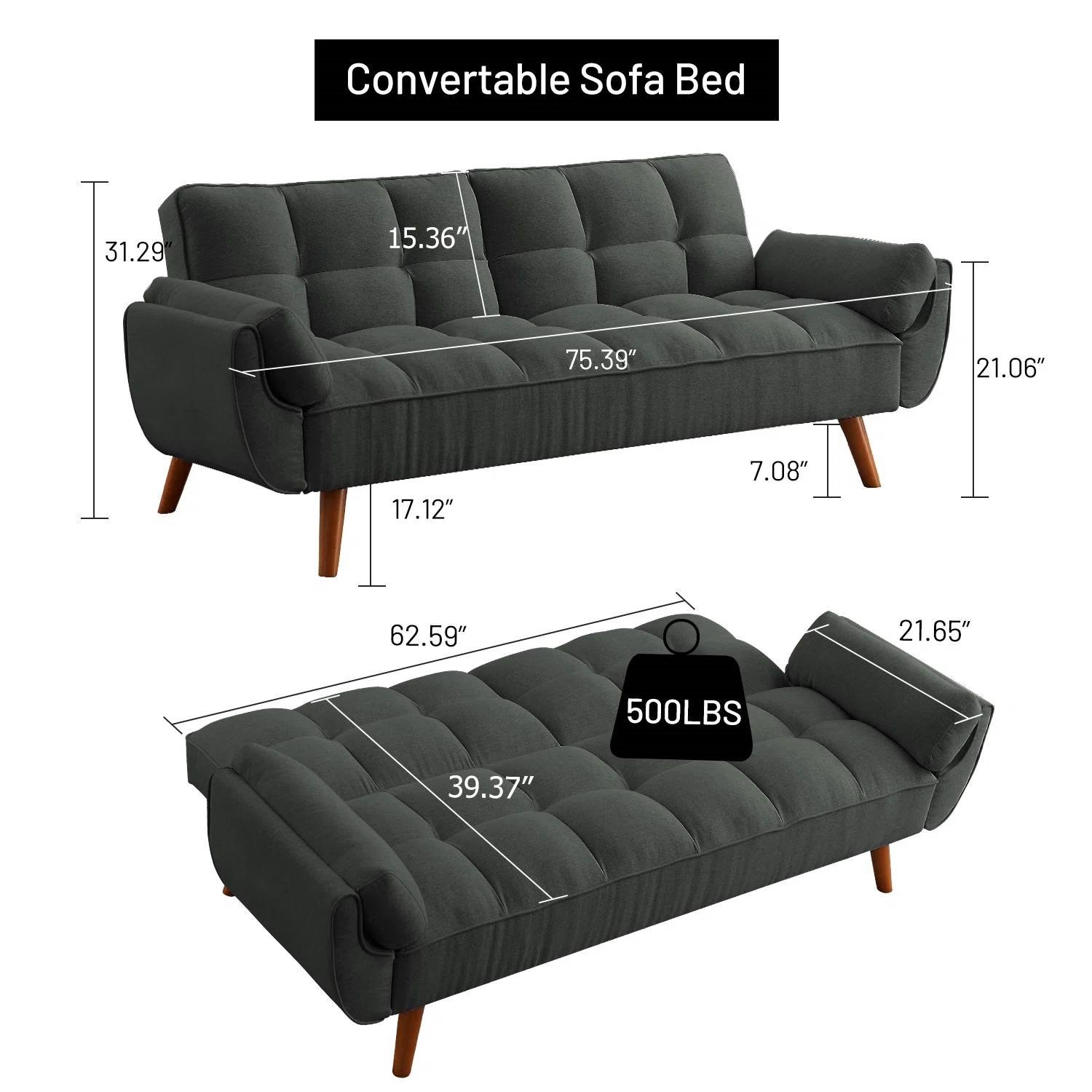 This Mid-Century Modern Sofa Bed in Dark Grey Linen Polyester Tufted Upholstery is built on eucalyptus wood frame,pillow top arm and tapered solid wood legs ,sturdy and durable for daily use. The seat and back cushions filled with high density sponge and sinuous spring ,comfortably sleeping on this couch. Easy to pull out and stow the adjustable split-back design futon sofa bed, reclined to lounge or sleeping position.When it's time to snooze,lay the backs down,turn this versatile sofa couch into a twin-size sleeper. Crafted of linen tufted ,a great mid-century modern inspired sofa bed, fits well for any occasion ,an accent addition to your living room,home office or guest room.Great for small space. Easy to assemble. The only assembly required is clipping the arms and attaching the legs.It takes about 20 minutes.The armrests come zipped underneath the seats of the couch.