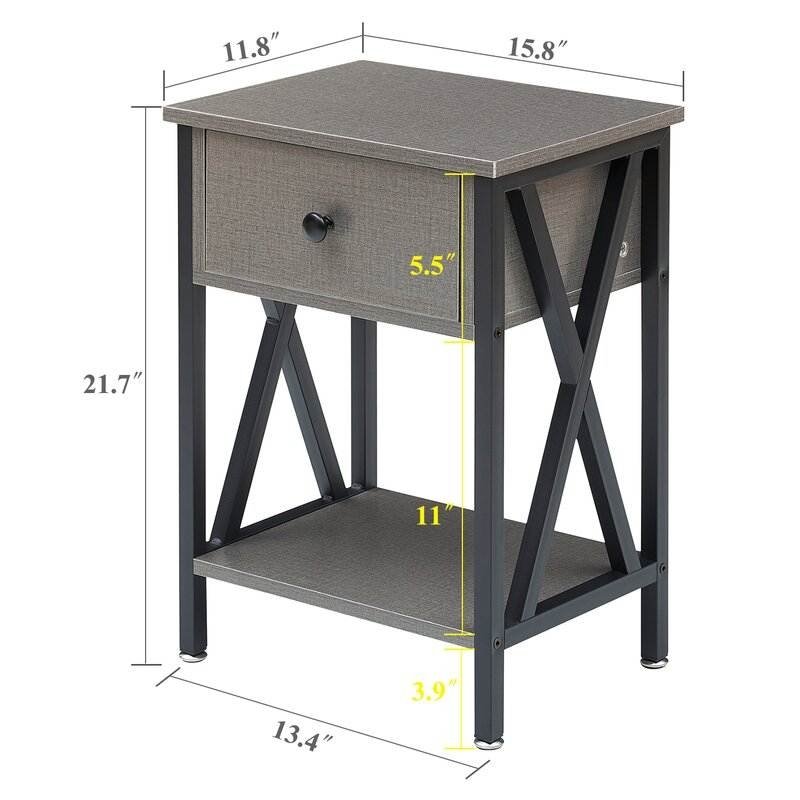 This Rustic 1 Drawer Gray Nightstand - Set of 2 showcases a mix of materials for a rustic and traditional look in any home. Each bedside table is made from steel and engineered wood and rests on straight legs with sleek X-shaped accents on the side. The single drawer with a black handle opens to reveal room for essentials like reading glasses and personals. An open shelf is ideal for a stack of books and organizational baskets. This nightstand set features 16" broad surfaces that accommodate a table lamp and a few accent pieces. Simple stylish design options are functional and suitable for any room, sturdy on a flat surface, and easy to assemble with parts and tools included.