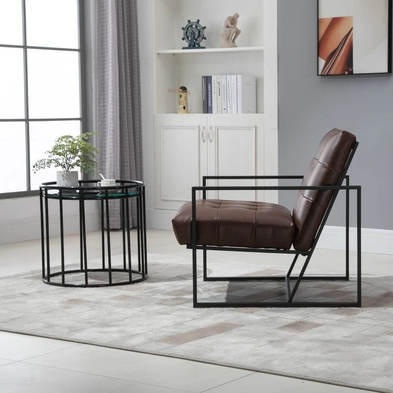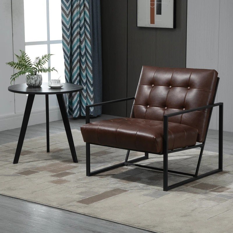 As a combination of industrial style and mid-century modern design, this Retro Tufted Faux Leather Metal Frame Accent Chair - Brown features a geometric steel frame, faux leather upholstery, and a tufted button. The inclined backrest and thickly padded cushion give you full support and a comfortable sitting experience. This modern accent chair matches your living room, bedroom, or home office.