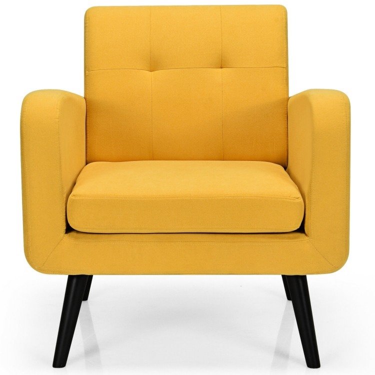 Sit back and relax in style with this Mid-Century Modern Linen Upholstered Accent Chair Wooden Legs - Yellow. The seat and back of this chair is filled with a highly elastic sponge, that's super soft and comfy. The breathable linen cover features a gentle texture and skin-friendly touch, offering a comfortable sitting experience. Made of a premium wooden frame, this accent chair combines excellent sturdiness and lasting durability. 4 rubberwood legs provide great support and stability, allowing the armchair to withstand up to 265 lbs. without wobbling.