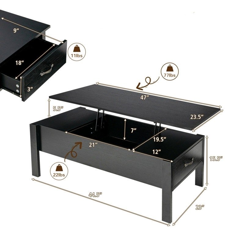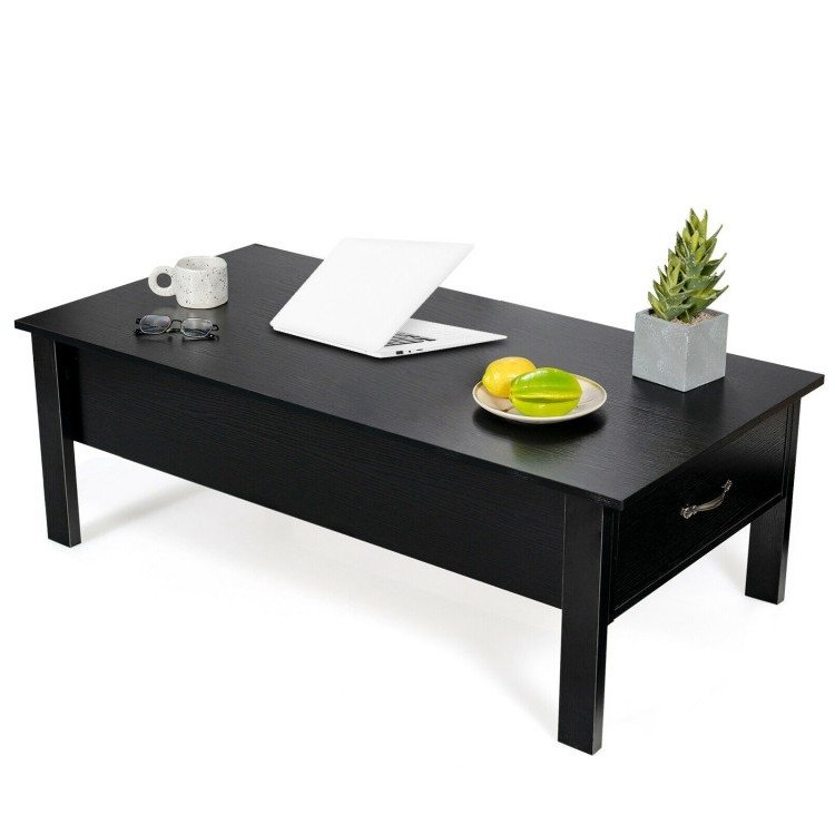 Equipped with a built-in hydraulic lifting mechanism, the top of this Modern Black Wooden Lift Top Coffee Table with 2 Side Drawers can be raised effortlessly. The lifting mechanism ensures that the lifting process of the desktop is smooth and silent, while always maintaining its stability and there are several crash pads on the table frame. This coffee table comes with 3 large storage sections, offering enough storage space. Two side storage drawers can be opened or closed easily with the help of drawer handles and smooth slides. Made of high-quality MDF and engineered wood, this coffee table is sturdy enough to stand firmly.
