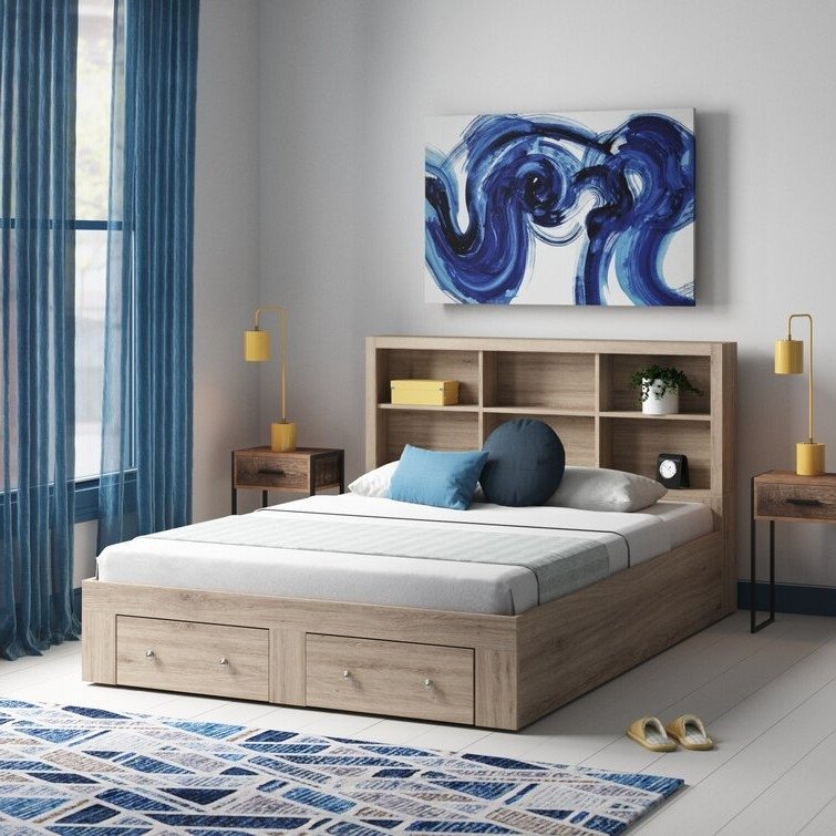 This King Size Rustic Oak FarmHouse Low Profile 2 Drawer Storage Platform Bed brings plenty of spare storage space for all your clothes. It's made from solid and engineered wood in a rustic oak finish with visible wood grain. The headboard has 6 open cubbies where you can keep nighttime reads, framed photos, or a few potted plants. In the footboard, there are 2 drawers that provide essential spare storage for your linens or sweaters. This bed arrives with slats and center support legs, so you don't have to use a box spring with your choice of mattress.