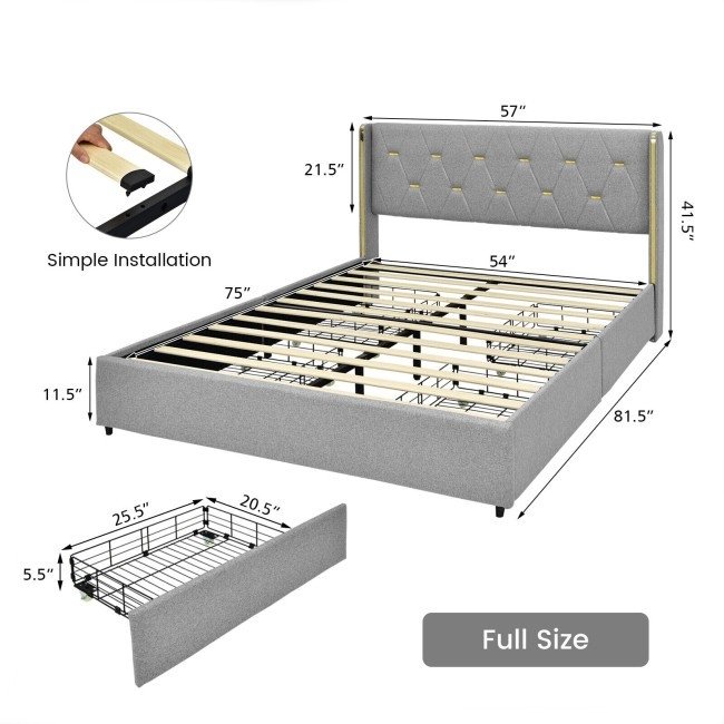 This Full Size Grey/Gold Linen Headboard 4 Drawer Storage Platform Bed is designed with 4 large drawers to accommodate your pillows, bed sheets, seasonal clothes and more. Crafted of high-density sponge and breathable linen fabric. The steel construction is sturdy enough to withstand a 660 lbs weight. With a tufted headboard, the bed frame looks very lavish and elegant, which definitely brings a sense of fashion to your bedroom. More, its installation is very simple. Each slat can be firmly installed by a hand pressing.