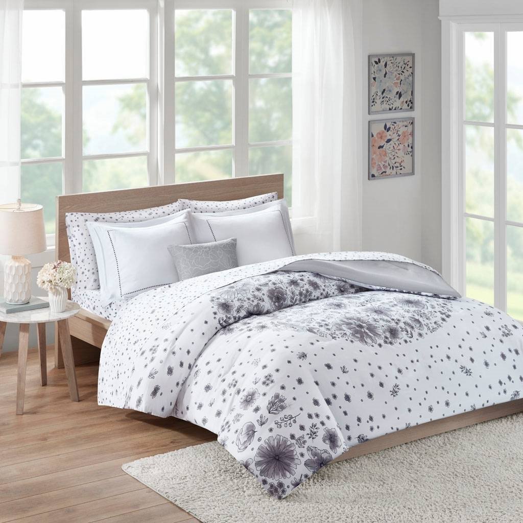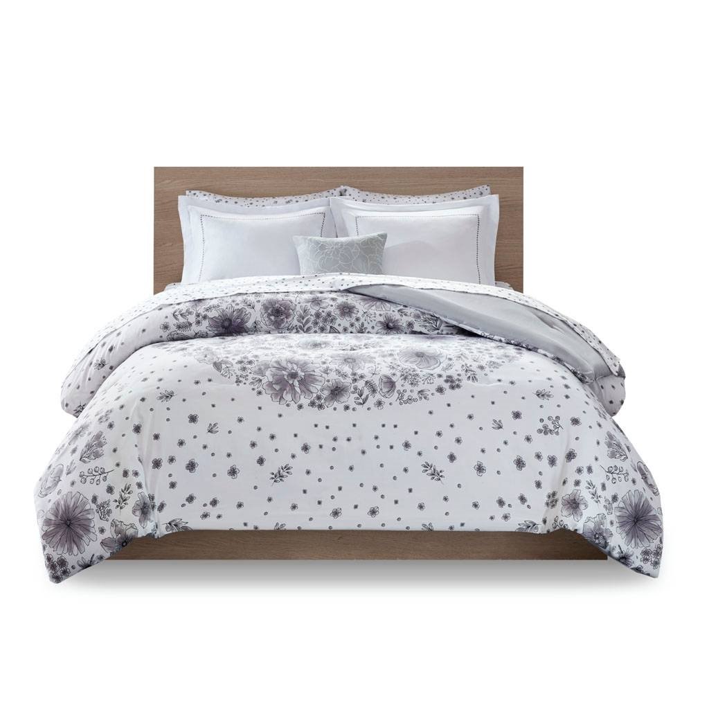 • Queen size 8-piece White Grey Floral Pattern Microfiber Comforter Set