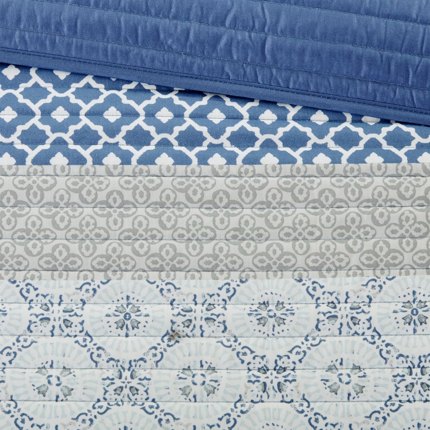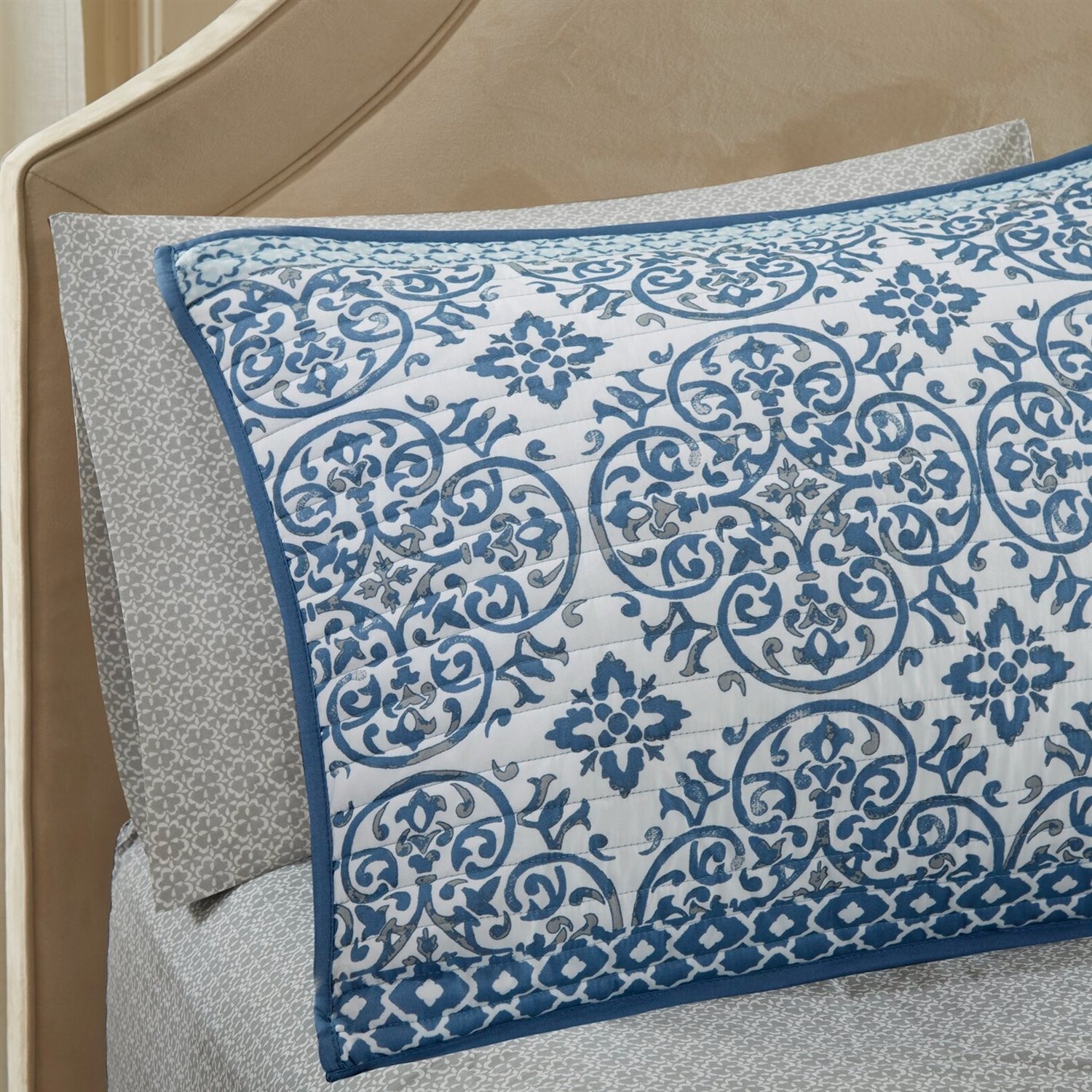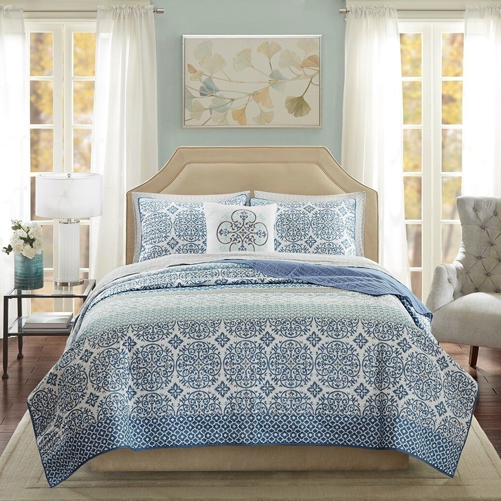 Bring a splash of color to your bedroom with this King Size 8-Piece Damask Motif Polyester Microfiber Reversible Coverlet Quilt set w/100% Cotton Sheet Set. This beautiful 100% Polyester quilted coverlet features a globally inspired printed motif in subtle gorgeous blue hues. This set comes with coordinating shams and 100% cotton sheet set.