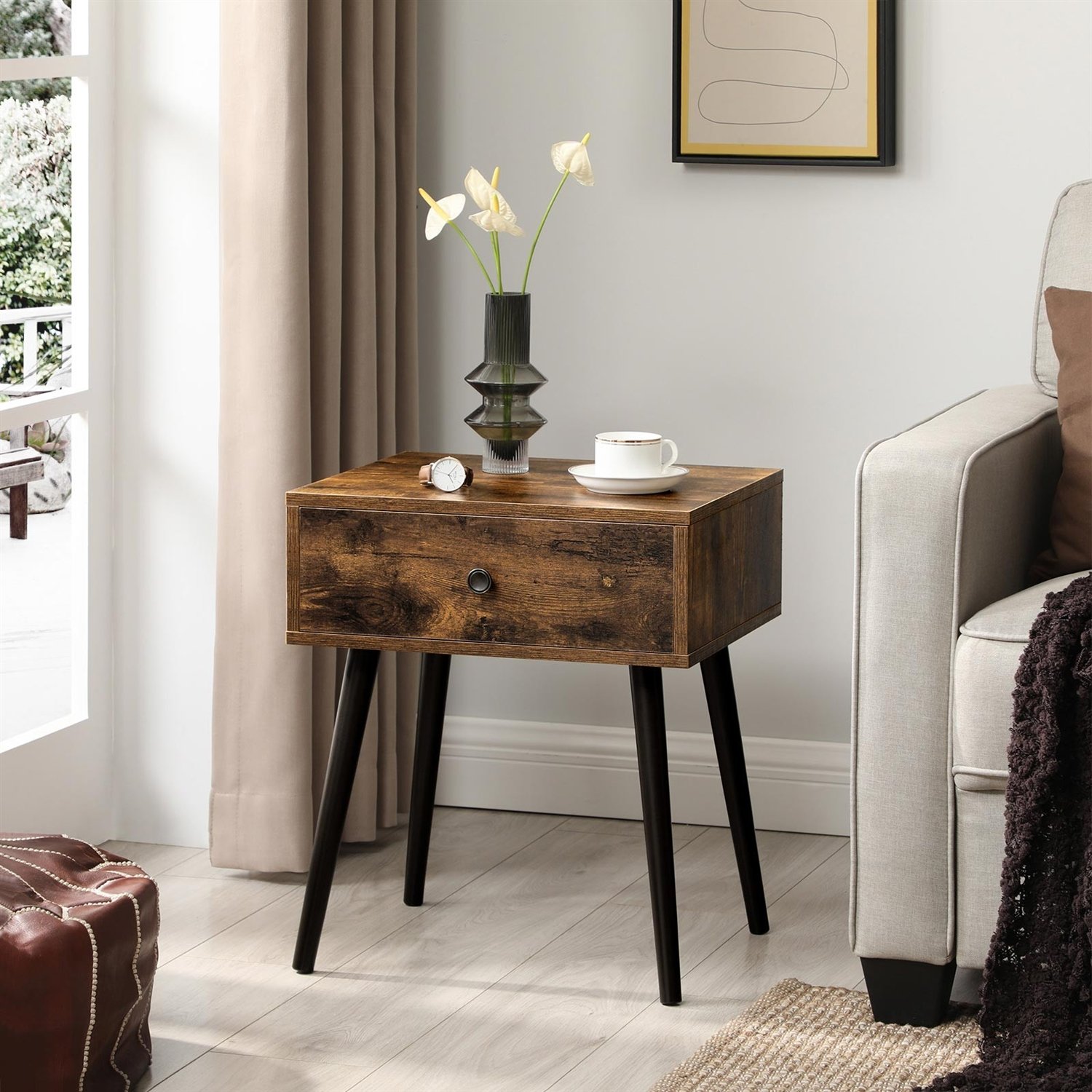 No complicated assembly with the Modern Rustic FarmHome End Table 1 Drawer Nightstand . Rustic modern tones injects a warm vibe, tapered legs recall old times, metal knob adds the finishing touch, this retro style nightstand lends lots of charm and helps you catch on to the trend of rustic bedroom furniture. The large drawer night is a great way to store valiable household items.