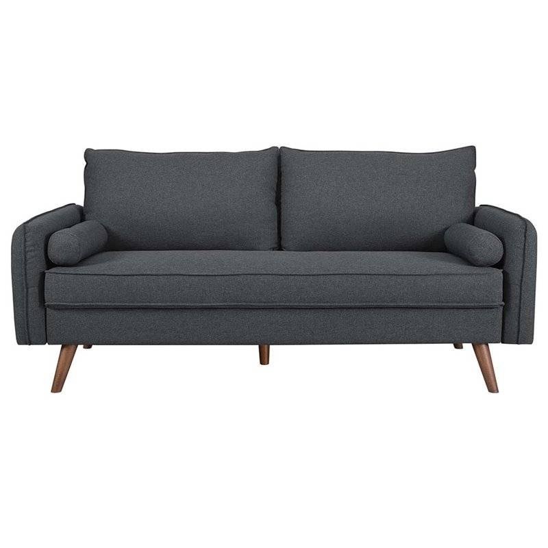 Give new vitality to your home or apartment living space with this Modern Grey Fabric Upholstered Sofa with Mid-Century Style Wood Legs. A comfortable yet tailored profile and two bolster pillows. It beckons guests to sit and stay a while. It's soft fabric upholstery grants this sofa an approachable appeal that’s echoed by it's calming color clean lines and splayed wood legs. Arriving directly to your doorstep in a convenient shipping box it easily unpacks to quickly become the most well-loved lounge spot in your home.