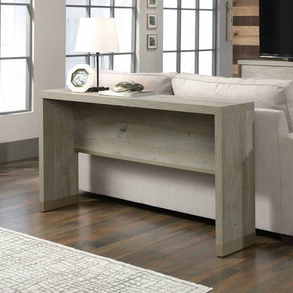 Give your living room a touch of of modern farmhouse beauty with the Modern Farmhouse Oak Living Room Console Sofa Table. Behind sofa table features a spacious top surface that provides you with the perfect amount of space to store and display a variety of different items like an accent lamp, decorative plants, your collection of photos. This narrow sofa table is finished on all sides for versatile placement throughout your home. Have it behind your couch or standing alone on a living room wall as a stunning accent piece. It looks great no matter where it stands! This modern sofa table also features powder coated metal end caps for an extra touch of detail that is sure to stand out in your home. Its strong and lightweight 1 ¾” panel construction makes it sturdy and easy to move. Finished in Farmhouse Oak, this one-of-a-kind sofa table is just what your living room needs.