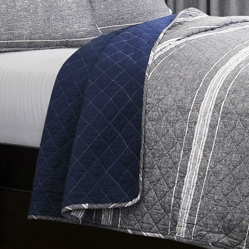 Pairing neutral hues of gray with a traditional stripe motif, this quilt set is an easy fit for just about any master suite or guest room. Crafted from 100% cotton, it offers a breathable design that can conveniently be maintained with a machine wash and tumble dry. When you feel like switching up your ensemble, simply reverse the coverlet for a navy quilted design that still pairs perfectly with the included shams.