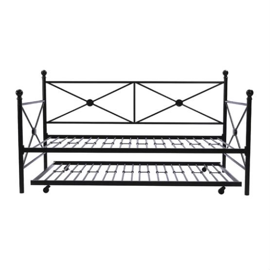 This Full size Black Metal Daybed Frame with Twin Roll-out Trundle is perfect for studio apartments, home offices, or guest rooms, daybeds are versatile additions to any abode. Crafted of metal in a semi-gloss black finish, this daybed strikes a rectangular silhouette with X-frame trellis panels, tall posts, and decorative ball finials. A slat system accommodates your preferred mattress (recommended 8"-thick, not included) without the need for a bulky box spring, while a roll-out trundle underneath accommodates a trundle mattress up to 6"-thick (not included).