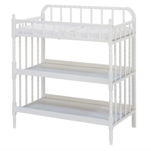 Delight in traditional beauty with this White Wood Changing Table with 1-inch Waterproof Changing Pad. Intricate spindle posts deliver classic grace from top to toe, for a perfect pairing with the Jenny Lind Crib. Spacious, open shelves keep diapers and lotions within easy reach for convenient changings. Changing pad and safety strap are included.