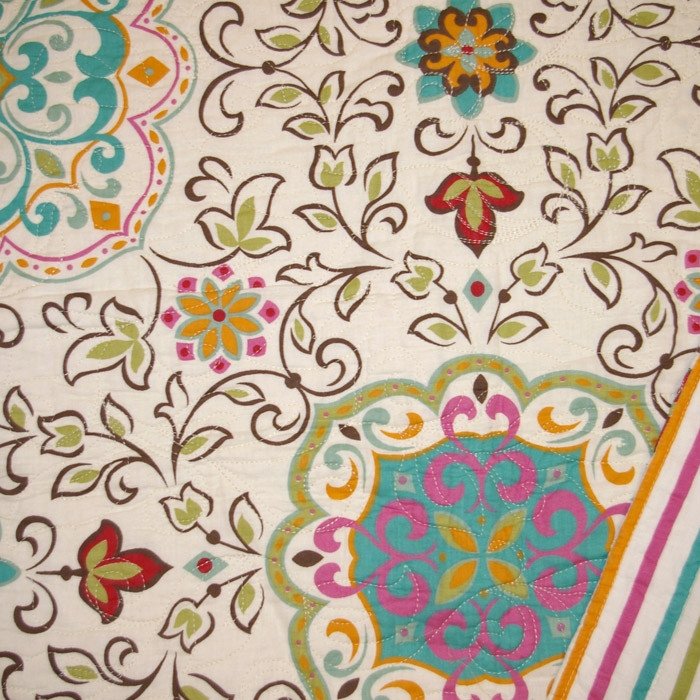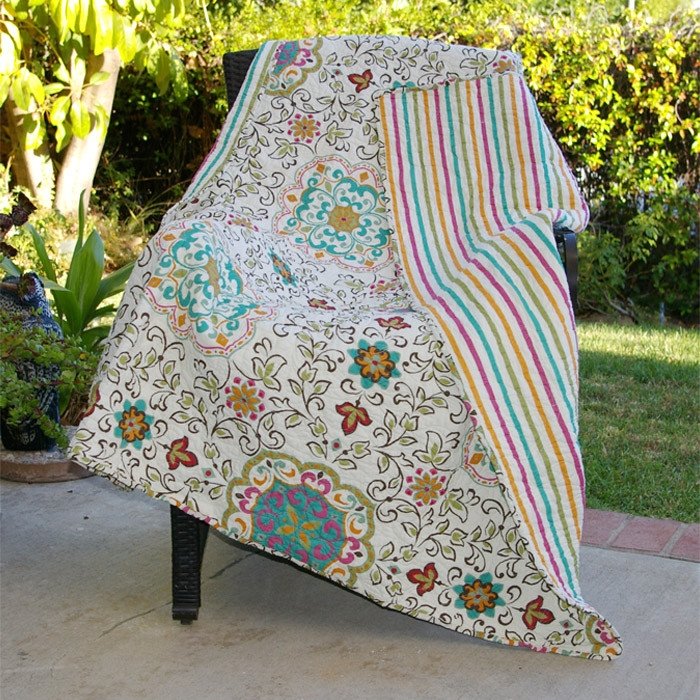Exotic and inviting, this 100% Cotton Throw Quilt Blanket with Bohemian Style Floral Pattern takes its inspiration from the bohemian lifestyle. Reverses to an all-over coordinating vibrant stripe for a two look in one. Intricate stylized floral stitch pattern in a rich, vibrant and earthy color palettes sets the romantic mood with a bit of vintage flair, perfect for any season.
