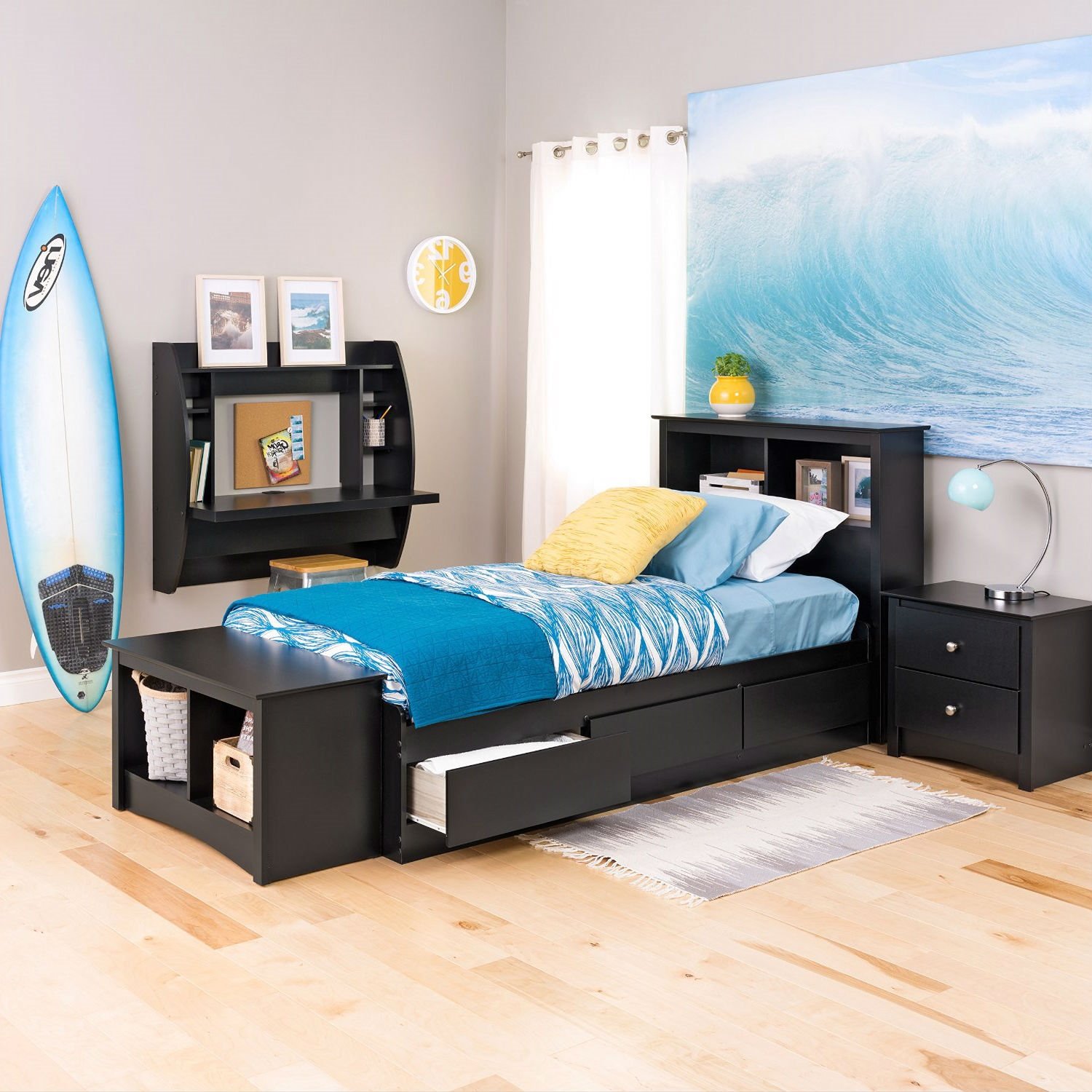 Optimize your space with this Modern Space Saving Wall Mounted Floating Laptop Desk in Black innovative and stylish wall mounted desk. Perfectly suited for any home office, den, living room, kitchen or entryway. The stable work surface is perfect for your computer or simply as a place to get your work done. The side compartments and top shelf provide functional storage and visual appeal. Installation is a breeze with this innovative metal hanging rail system. Proudly manufactured in North America using CARB-compliant, laminated composite wood. Ships Ready to Assemble, includes an instruction booklet for easy assembly and has a 5-year manufacturer's limited warranty.