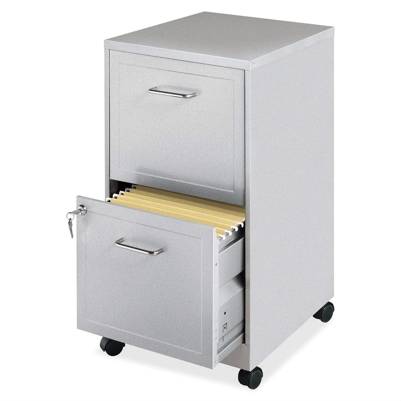 This Gray Silver Metal 2-Drawer File Cabinet with Casters features two locking file drawers with smooth glide suspension to store your important, frequently used documents. The full high-side drawers accommodate letter-size, hanging file folders. The lock secures both drawers. Four casters allow you to move the pedestal where you need it. Design also includes an 18" depth, optional caster kit, chrome pull handles and steel construction with a baked enamel finish. Overall Dimensions: 24.5" x 14.3" x 18" (H x W x D). Color: Gray.