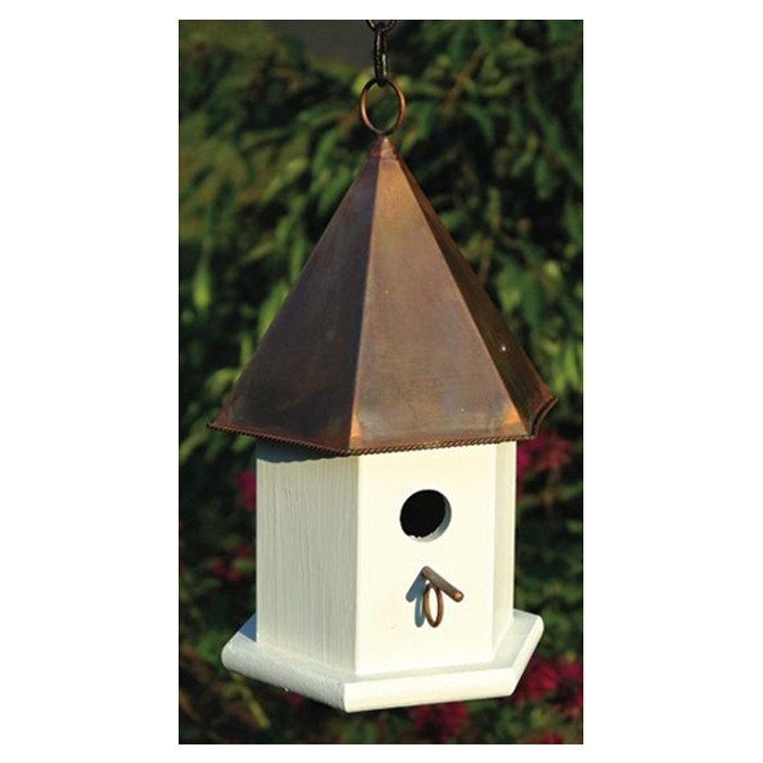 This White Wood Songbird Birdhouse with Brown Copper Roof has a stylish hexagonal body of solid cypress and a six sided roof. Remove roof and clean out debris, spray with a mild bleach and water solution then rinse thoroughly and let dry in the sun.