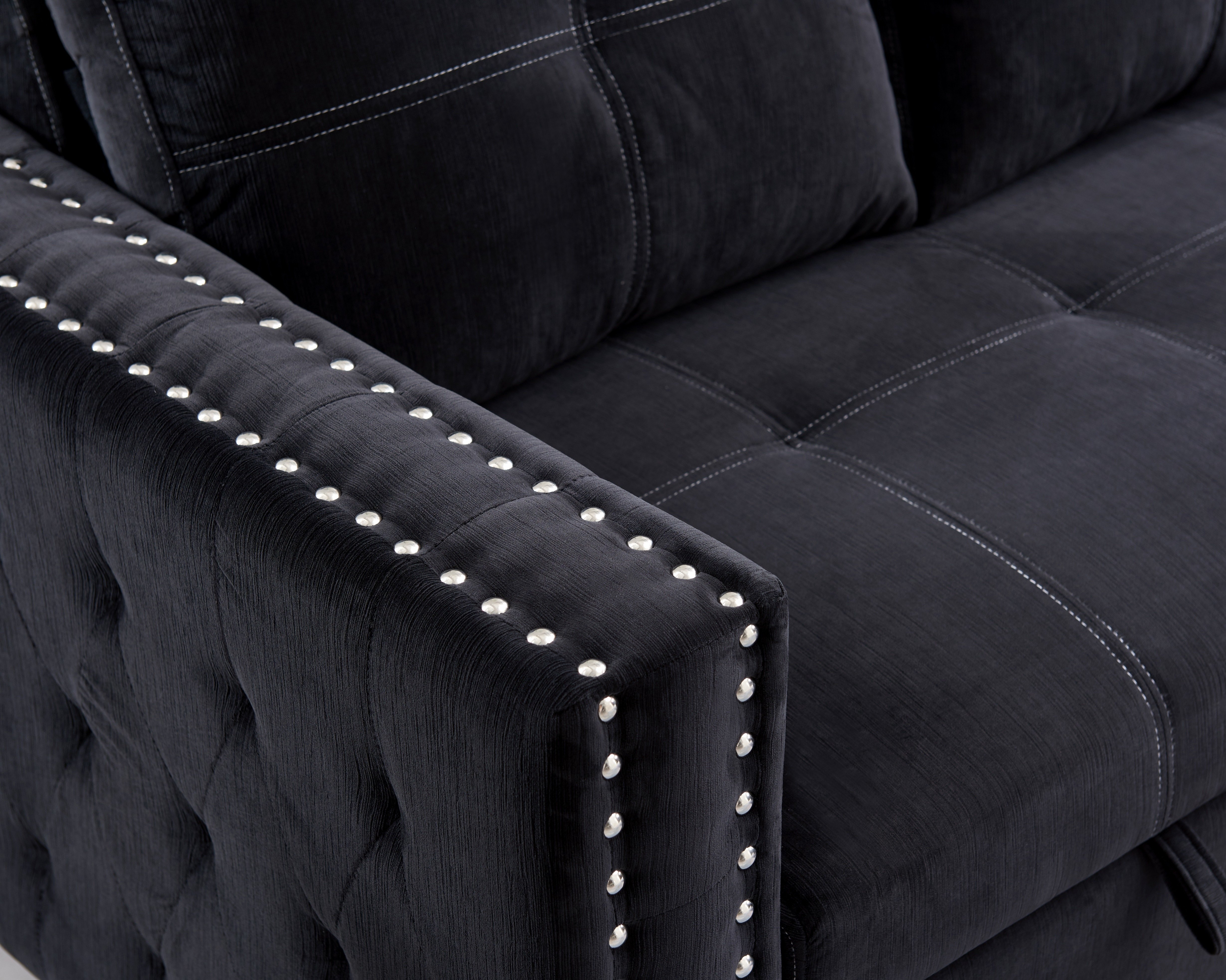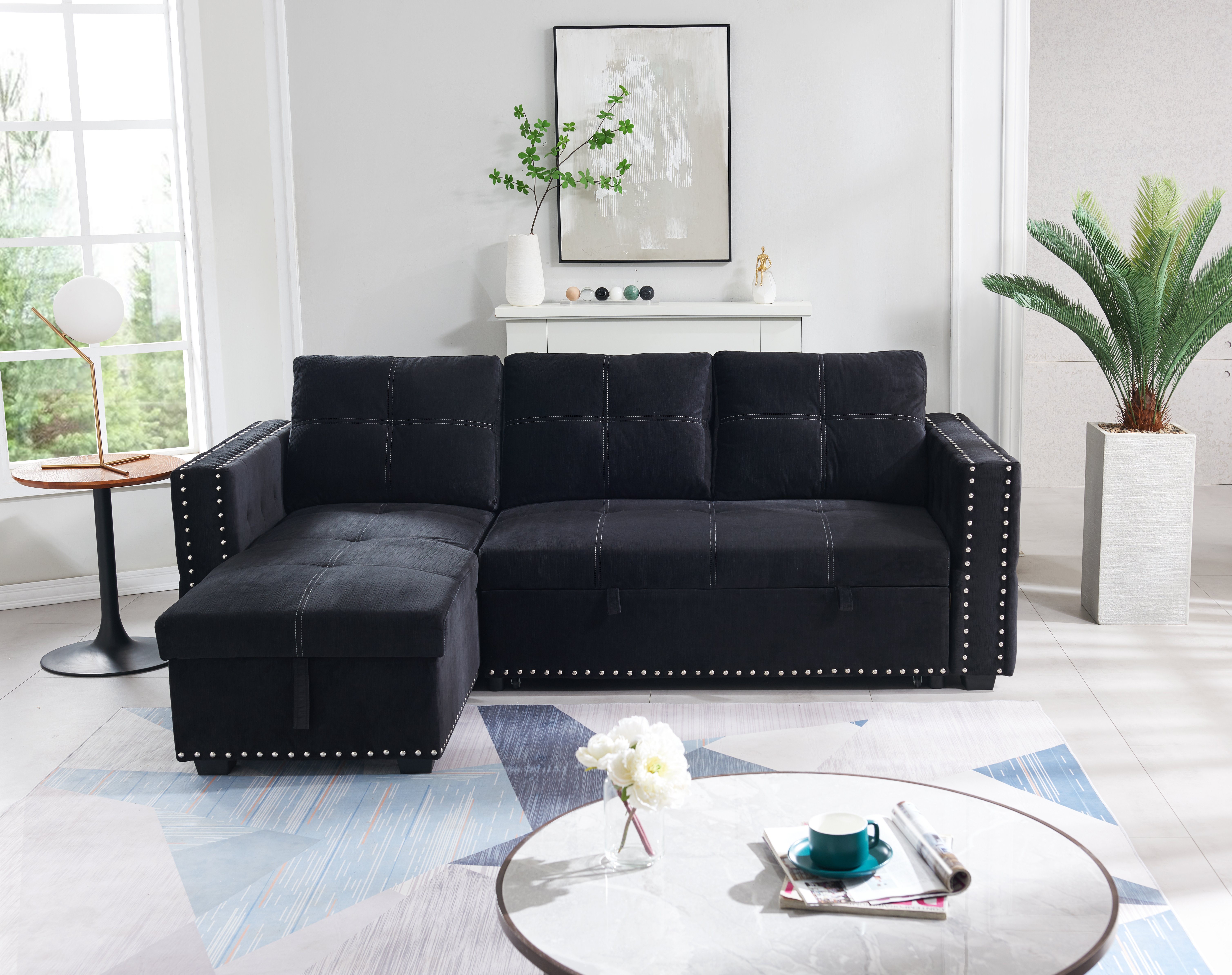Sectional sofa with pulled out bed; 2 seats sofa and reversible chaise with storage; both hands with copper nail