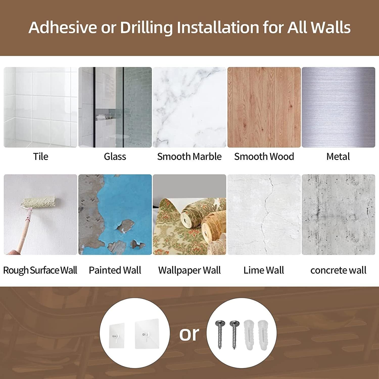 1.[EASY TO INSTALL,NO ASSEMBLEY] The shower caddy comes with both screws and adhesive strips, you can choose drilling or adhesive mounting, no assembly required. Note: The adhesives works on smooth ceramic tiles, smooth marbles, glass, metal, and solid woods, not works on printed wall or dry wall.