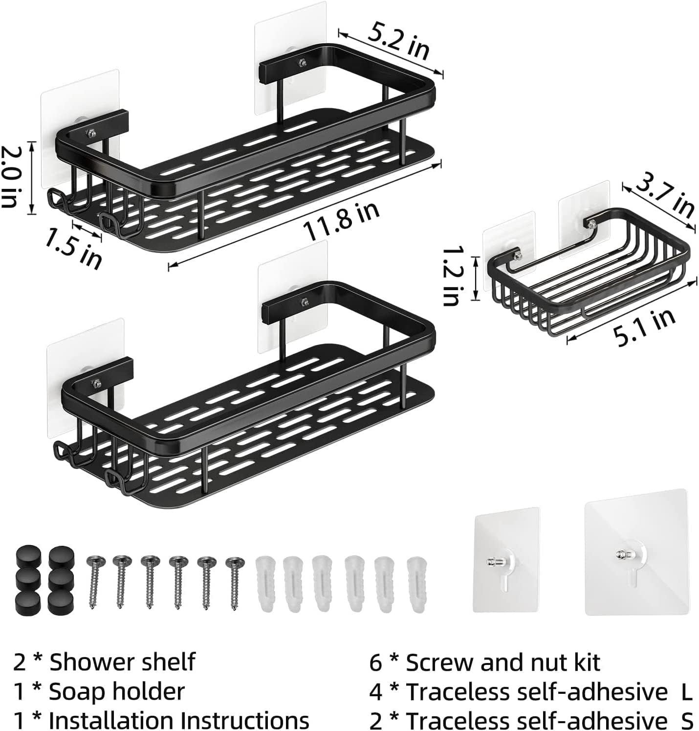 5.[WHAT YOU GET] 2 shower caddy, 1 soap holder, 6 adhesive strips(4 big and 2 small), drill mounting screws and anchors, installation instruction.