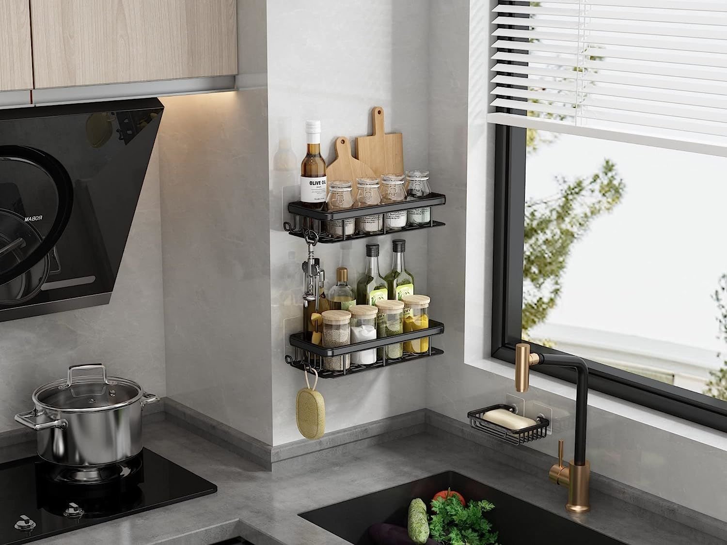 2.[MULTIPURPOSE] The shower wall shelf comes with soap holder and 4 fixed hooks, we can mount it over sink or shower room to organize soap,shampoo and hung shaver, towels. It’s also suit for kitchen to hung dishcloth, sponge, brush or on the side of the refrigerator to organize spices.