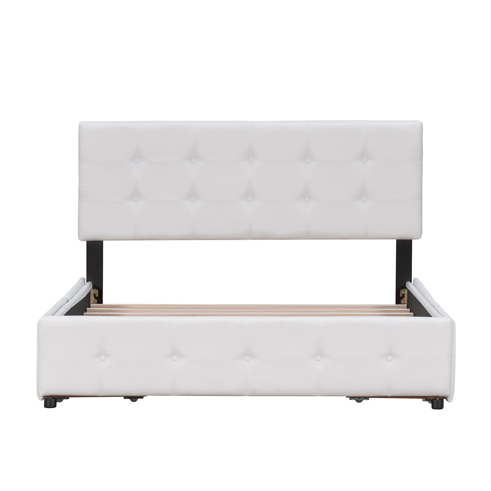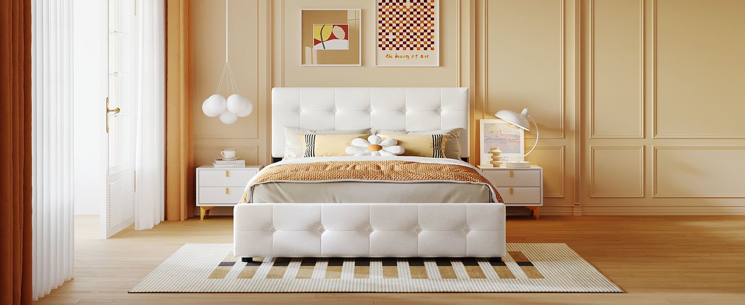 This beautiful Upholstered Platform Bed features button tufted upholstered headboard that adds a contemporary chic look to your bedroom and filled in thick foam to add extra comfort.Sturdy wood frame construction and a wooden slat system to add extra stability and safety. Despite its size and solidity; this piece comes with hardware and instructions included and anyone can assemble it; without a problem. The upholstered platform bed with four drawers can easily be pulled in and out for maximum storage space; perfect for organizing anything from clothes and bed linens to toys and games.